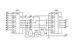 Операции сложения и вычитания проводятся с ускоренным переносом из разряда в разряд. Кроме того, имеется вход приема сигнала переноса Сn.