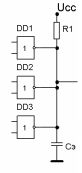 С физической точки зрения, чем больше величина этого резистора, тем меньше ток в цепи стока транзистора одной из открытых микросхем DD1, DD2 или DD3. Одновременно с ростом R1 увеличивается время заряда эквивалентной емкости Сэ, равной сумме выходных и входных емкостей микросхем, а так же емкости монтажа.