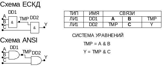 На рис.2.2 представлены графический и табличный способы описания схемы, реализующей логическую функцию 3И ( Y= A & B & C) на элементах 2И (Y= (A & B) & C). Слева на рисунке показаны примеры графического представления схемы в стандартах Единой Системы Конструкторской Документации (ЕСКД), принятой в России и ниже- Американского национального стандарта (ANSY).Слева входы схемы ( А,В,С),справа выход Y.