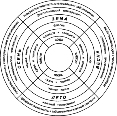 Так, в первом круге схемы фигурируют четыре элемента из числа субстанциальных начал мирообразовательного процесса древних «учителей фюсиса». Во втором представлены сочетания качеств, выражающих атрибутивные свойства субстанциальных элементов (или «начал»). Третий круг включает родственные соответствующим элементам и качествам, жидкости, а четвёртый, - соотнесённые с ними времена года и возрастные особенности. Наконец пятый круг охватывает группу психологических темпераментов120, отвечающих отдельным физиологическим (природным) состояниям организма, а шестой содержит указание о прогнозах возможных заболеваний.