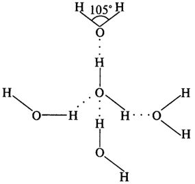 Строение: Молекула воды состоит из одного атома кислорода, который соединен с двумя атомами водорода, при этом связи O-H образуют угол в 104,5°, при при этом общие электронные пары смещены к атому кислорода, который более электроотрицателен по сравнению с атомами водорода, поэтому, на атоме кислорода формируется частичный отрицательный заряд, соответственно, на атомах водорода - положительный. Таким образом, молекулу воды можно рассматривать, как диполь.