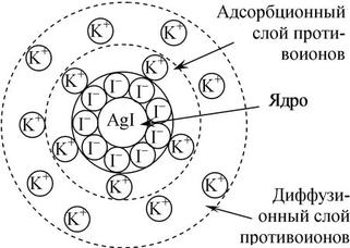 Частицы коллоидных растворов называются мицеллами. Основой мицеллы является ядро коллоидной частицы, которая адсорбирует на своей поверхности ионы, присутствующие в растворе, образуя тем самым адсорбционный слой, в котором ионы достраивают кристаллическую решетку ядра, придавая ему отрицательный заряд. Такие ионы называются потенциалоопределяющими. Присутствующие в растворе ионы, противоположные по знаку потенциалоопределяющим ионам, носят название противоионов.
