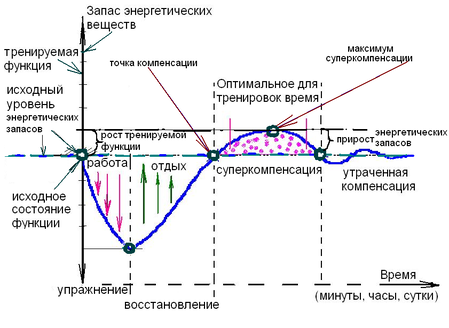 Фаза суперкомпенсации явление временное, проходящее. Выраженное (и даже ощущаемое) превышение исходного уровня энергетических веществ постепенно снижается и возвращается к норме. Чем больше расход энергии при работе, тем быстрее происходит ресинтез энергетических веществ и тем значительнее превышение исходного уровня в фазе суперкомпенсации. Разумеется, такая прямо пропорциональная зависимость проявляется в ограниченных пределах. При чрезмерно напряженной работе, связанной с очень большим расходом энергии и накоплением продуктов распада, скорость восстановительных процессов может снизиться, а фаза суперкомпенсации будет достигнута в более поздние сроки и выражена в меньшей степени.