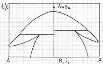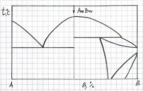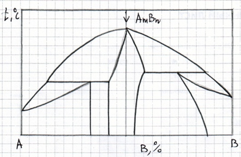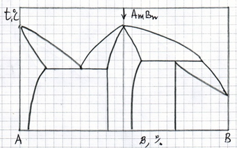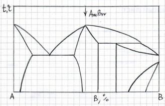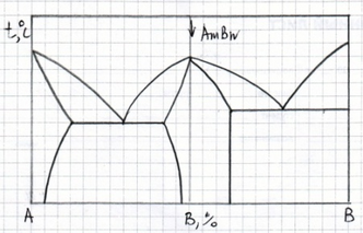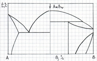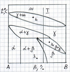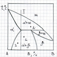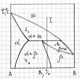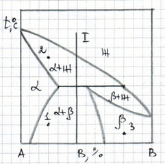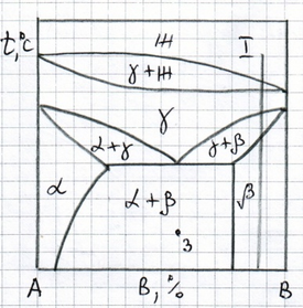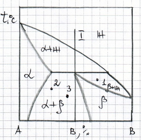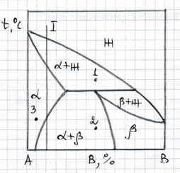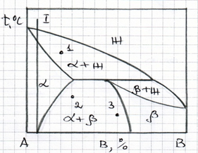 Нарисуйте кривую охлаждения из жидкой фазы сплава №1, приведенного на диаграмме состояния №2, указав превращения, происходящие при охлаждении. Укажите структуру сплава после охлаждения.