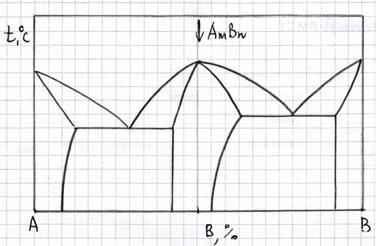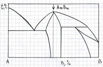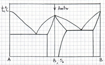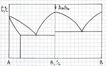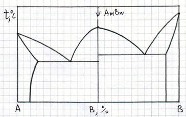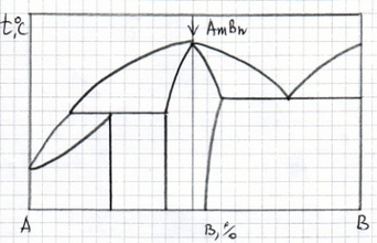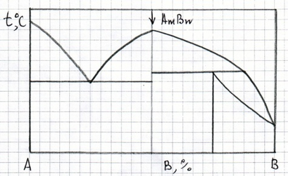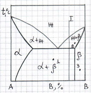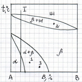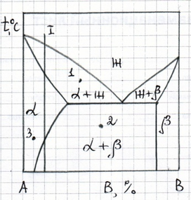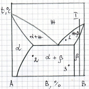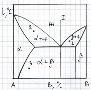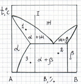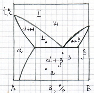 Нарисуйте кривую охлаждения из жидкой фазы сплава №1, приведенного на диаграмме состояния №2, указав превращения, происходящие при охлаждении. Укажите структуру сплава после охлаждения.