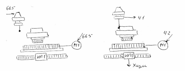 При измерительном цикле сигнал G65 приходит на датчик, включая его и на двигатель М3 привода подач.