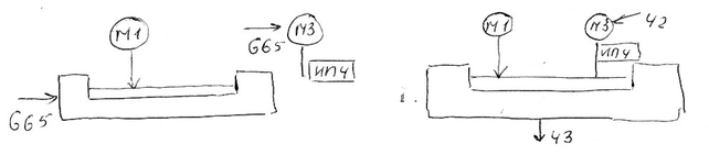 При достижении точки М60 выдается сигнал 48 (управление приводом), сигнал 48 запускает двигатель М14 привода движения перегрузочного устройства (Д). Перегрузочное устройство поворачивается на +180 градусов до срабатывания концевого выключателя, формирующего осведомительный сигнал 49, останавливающий привод вращения. По сигналу 49, поступающему на электромагнит 15 происходит включение золотника гидроцилиндра ГЦ8 (рисунок г). Под давлением масла в нижней полости гидроцилиндра 8 осуществляется подъем перегрузочного устройства. Как только оно достигнет нужного положения, вырабатывается сигнал 50. Сигнал 50 является входным для ЭМ13 золотника ГЦ5 (рисунок в). Увеличение давления масла в левой полости гидроцилиндра 5 заставляет манипулятор перемещаться в направлении стола станка. Перемещение продолжается до момента срабатывания концевого выключателя, выдающего осведомительный сигнал 51. Сигнал 50 подается в левую полость на электромагнит 15. Осведомительный сигнал поступает на электромагнит 16 золотника ГЦ8 (рисунок б). Под давлением масла в верхней полости ГЦ8 осуществляется опускание перегрузочного устройства до срабатывания концевого выключателя, формирующего осведомительный сигнал 52. По сигналу 52, приходящему на электромагнит 14 золотника ГЦ5. Масло подается в правую полость ГЦ5, шток которого вместе с манипулятором перемещается к перегрузочному устройству. Перемещение происходит до момента срабатывания концевика, который выдает сигнал 53. Сигнал 53 поступит на электромагнит 12 ГЦ4, вызывая перемещение штока вправо, что позволяет осуществлять зажим стола-спутника в рабочей зоне стола станка (рисунок б). По достижении положения фиксации стола-спутника вырабатывается осведомительный сигнал 54. По сигналу 54 происходит снятие сигнала 40 с электромагнита 9 (рисунок а). Шток пневмоцилиндра ПЦ3 перемещается вправо и происходит закрытие защитной шторки (рисунок а). После закрытия концевой выключатель выдает осведомительный сигнал 55 (шторка закрыта). Цикл завершается.