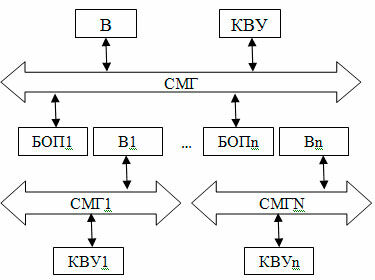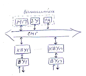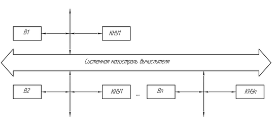 Структура построения с общей магистралью контроллеры внешних устройств КВУ1…КВУN сопрягаются с вычислителем общей магистралью. В этой структуре нагрузочная способность системной магистрали ограничивает возможности расширения функций УЧПУ в следствии ухудшения помехоустойчивости.