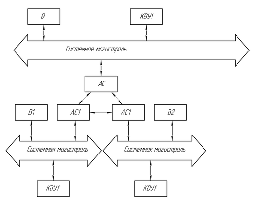 Каждый вычислитель при распределенной структуре имеет свой контроллер (переферийных устройств), объекта управления, ЭВМ верхнего уровня.