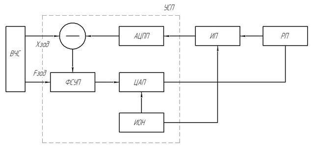 Фактическое положение регулируемого привода РП в данном случае определяется с помощью ИП положения с цифровым выходным сигналом. Это кодовой и импульсно-кодовый ИП. Сигнал Хзад от вычислителя ВЧАС сравнивается с сигналом обратной связи от аналогово-цифрового преобразователя АЦПП, связанного с измерительным преобразователем. Сигнал Fзад поступает ФСОП и в данной схеме является устройством преобразования цифровой информации. Основная задача – суммирование и вычитание кодов в цифровом виде.