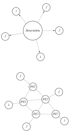 Обмен информацией между вычислителями при распределенной структуре менее интенсивен чем при сосредоточенной.