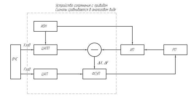 Фактическое положение регулируемого привода РП определяется с помощью ИП положения с аналоговым выходным сигналом. Это индукционные ИП, работающие в фазовом или разностном режиме (вращающийся трансформатор, линейный индукторсин). Питание ИП осуществляется от источника опорного напряжения ИОН, вырабаываемый вычислителем код задания положения Хзад и преобразовываться в аналоговый сигнал. Результат сравнения Хзад и Хфакт используется с формирователе сигнала управления (ФСУП). Кроме Хзад . (по скорости это ЦАП и доп сигнал на ФСУП). На выходе ФСУП как правило мы имеем аналоговый сигнал в виде постоянного напряжения.