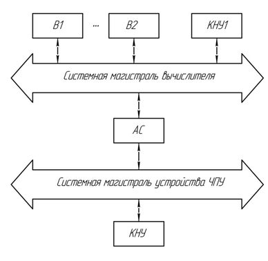 Для улучшения нагрузочной способности используют вариант однопроцессорной структуры с двумя магистралями, сопряженния между которыми осуществляется через адаптер связи. В этой структуре контроллеры внешних устройств дисплея и клавиатуры оператора обычно сопрягаются с системной магистралью вычислителя. А контроллеры электроприводом, устройства работы электроавтоматики сопрягаются с системной магистралью устройства ЧПУ. Использование такой структуры более эффективно, потому что контроллеры внешних устройств станка для связи с несколькими однотипными внешними устройствами обычно выполняют на одной плате, что является по отношению к системной магистрали одной единицей нагрузки.