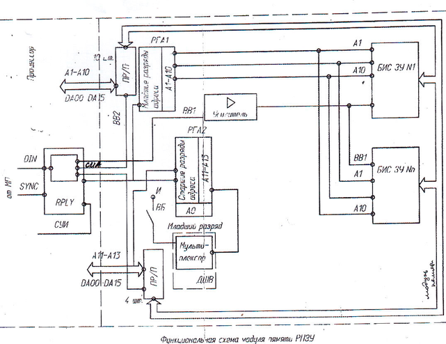 Схема управления интерфейсом принимает от микропроцессора сигнал DIN, SIGN по управляющей шины СМП и формирует сигналы SEAK и RPL. Микропроцессор выставляет адреса с А1 по А13 на регистры адресов РГА1 и РГА2 через шину адреса данных ДА00…ДА15 через приемо-передатчики ПРП. Сигналом СИА производится фиксация младших и старших разрядов адреса в регистрах РГА. Три старших разряда (А11, А13) поступает на мультиплексор (Мультиплексор это то же самое, что и ДШВ) и сравниваются с номером модуля банков памяти ВБ. Если адреса с номером модуля запоминающего устройства совпали, то можно осуществляться операции считывания или записи в запоминающее устройство. Это значит, что должно быть получено разрешение на прием сигнала DIN с управляющей системной магистрали. Помимо сигналы SEAK схема управления интерфейсом схема управления SUE из сигнала DIN формируется сигнал ВВ1 и ВВ2. (ВВ1 – чтение, ВВ2 – запись). ВВ2 используется для переключения приемопередатчиков (РГД - регистры данных) из режима прием адреса в режим передачи данных.