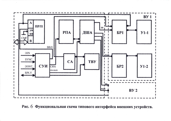 На схеме показано одновременное расположение двух внешних устройств ВУ1 и ВУ2 на одном ТЭС. Входящие в состав ВУ1 блоки У1-1 и У1-2 соответственно передают и принимают информацию от микропроцессора. Каждое из устройств также имеет буферные регистры БР1 и БР2, обеспечивающие асинхронный обмен данными между микропроцессором и внешним устройством. Обмен данными между буферными регистрами КВУ и системной магистралью осуществляется типовым интерфейсом связи, в состав которого входит СУИ, селектор адреса СА, триггер выбора устройства ТВУ, регистр под адреса РПА (запоминает два младших разряда адреса внешнего устройства), дешифратор ДША (разрешающий чтение или запись данных буферных регистров, который будет соответствовать определенной комбинации младших разрядов адреса и сигналов ВВ (ввод или вывод на входе СУИ).