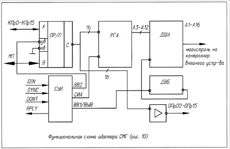 В состав адаптора входит приемопередатчики ПП, схема управления интерфейсом СУИ, формирующая сигнал синхронизации СИА, регистр адреса адаптора РГА, дешифратор выбора банка ДВБ, дешифратор адаптора ДША. Сигналом СИА фиксируется адрес в регистре адреса РГА адаптора. Сигнал ВВ1/вывод разрешает дешифрацию старших разрядов адреса, сигнал ВВ2 осуществляет изменение направления передачи данных при появлении сигнала DIN в машине управления СНГ. Дешифратор выбора ДВБ разрешает выбор одного из восьми банков тремя старшими разрядами адреса. Данные от системной магистрали 2 для записи в микропроцессор поступает по линии КПР0-КПР15. А данные от микропроцессора в системную магистраль 2 по линии ОПР0-ОПР15.
