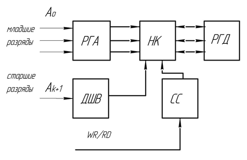 Модуль памяти состоит из регистра адресов РГА, дешифратора ДШВ, схемы согласования СС, накопителя НК (набор БИС ЗУ) и регистра данных РГД. Младшие разряды адреса поступают в РГА, запоминаются там и определяют адрес ячейки памяти внутри модуля ЗУ. Старшие разряды адреса поступают на дешифратор и определяют конкретный модуль памяти ЗУ. Сигнал WR/RD – чтение/запись поступает на схему согласования и определяет вид операций с записью (чтение/запись). При чтении РГД хранит данные, считанные из модуля памяти. При записи информации РГД пропускает данные в накопители.