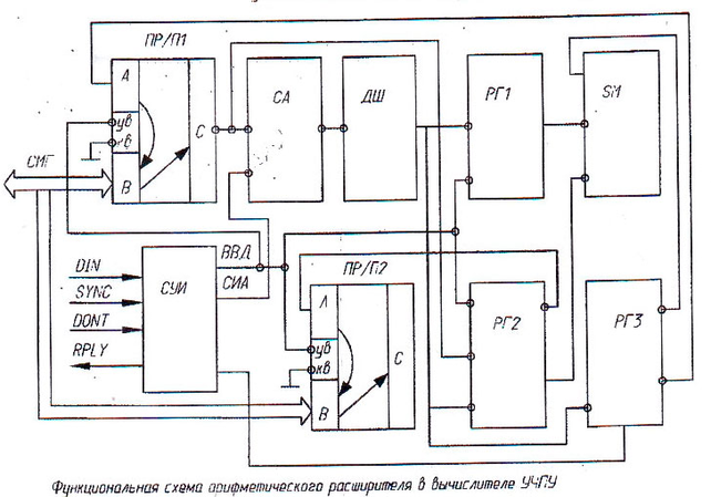 Микропроцессор обращается к расширителю арифметических функций к внешнему устройству, так как внешний адрес находится в адресном пространстве внешних устройств. Работа СУИ аналогична работе СУИ предыдущей схемы. Только сигналом СИА фиксируется только младшие адреса РА в селекторе адреса СА. Этим определяется к какому из трех адресуемых регистров на схеме РГА1, РГА2, РГА3 идет обращение. В регистр РГА1, РГА2, РГА3 можно записывать информацию и считывать. Это достигается также путем изменения режимов работы приемо-передатчиков ПП. При записи информации на РГ1, РГ2 работает приемопередатчик ПРП1 (направление БЦ). При чтении информации с РГ3, РГ2 работают оба приемопередатчика (ПРП1, ПРП2). В РГ1 записывается множимое число. В РГ2 множитель, в РГ3 результат промежуточных вычислений. В сумматоре производится операция сложения (с целью получения результатов умножения). Регистратор вычислений хранится в двух регистрах РГ2 и РГ3. И в последующем используется микропроцессором для конкретных типов задач в процессе проводимых промежуточных вычислений.