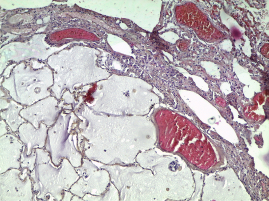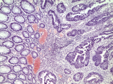 В одной части препарата обнаруживаем нормальное строение слизистой оболочки. На большем протяжении слизистая представлена опухолевой тканью, паренхима ее состоит из причудливых ветвящихся железистых трубочек, эпителий которых полиморфный; ядра крупные, сочные, гиперхромные с множеством митозов. Такие же железистые образования видны в подслизистом и мышечном слоях стенки. В строме опухоли воспалительные инфильтраты, очаговые кровоизлияния.