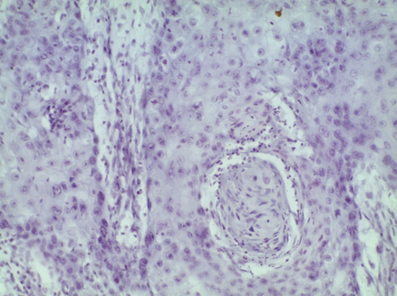 Пласты и тяжи атипичного плоского эпителия врастают в подлежащую соединительную ткань и в мышечную оболочку пищевода. В центре пластов происходит ороговение эпителия – образуются так называемые «раковые жемчужины». В строме опухоли инфильтрация преимущественно лейкоцитами и плазматическими клетками. Обратить внимание, что в имеющихся в препарате небольших лимфоузлах метастазов еще нет.