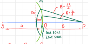 Разбиение волновой поверхность на кольцевые зоны построенные так что рассматривает оти краев каждой зоны до точки P отличают на λ/2 (λ длина волны в среде)