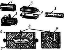 Рис. 1. Деталь, отливка, элементы формовочного комплекта и песчаная форма: 1 — готовая деталь; 2 — отливка; 3 — разъемная модель; 4 — стержневые знаки; 5 — стержень; 6, 7 — верхняя и нижняя опоки; 8 — выпор; 9 — литниковая система