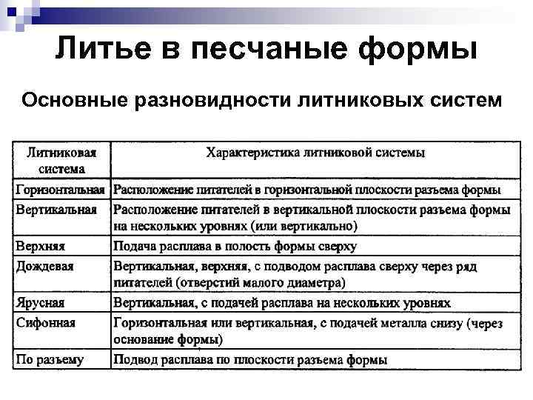 | ЛПФ Литье в песчаные формы | Экономичность технологического процесса. Большое разнообразие форм отливок. Большой диапазон массы и размеров отливок. | В основном, в качестве материала отливок используется серый чугун, обладающий хорошей жидкотекучестью и малой усадкой. Реже используется сталь. Весьма ограничено производятся отливки из цветных металлов и сплавов. Качество металла отливок низкое, что связано с возможностью попадания в металл неметаллических включений, газовой пористостью (из за бурного газообразования при заливки металла во влажную форму) Низкая чистота поверхности и точность размеров. Поэтому сопрягаемые поверхности деталей, заготовки которых получают ЛПФ, всегда обрабатываются резанием. |