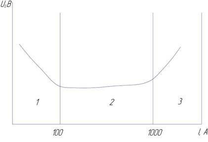 Электрические свойства дуги описываются ее вольтамперной характеристикой. Зависимость напряжения дуги от тока в сварочном контуре называется статической вольтамперной характеристикой дуги. Вольтамперная характеристика дуги имеет три области: падающую – 1, жесткую – 2 и возрастающую – 3. (рис. 21)