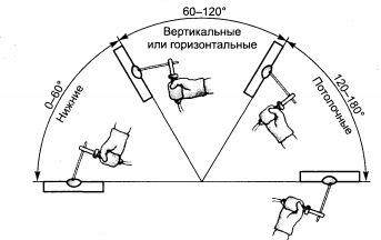 По положению в пространстве различают нижние, горизонтальные, вертикальные и потолочные швы (рисунок 12). Отличаются они друг от друга углами, под которыми располагается поверхность свариваемой детали относительно горизонтали. Наиболее труден для исполнения потолочный шов, лучше всего шов формируется в нижнем положении. Потолочные, вертикальные и горизонтальные швы приходится обычно выполнять при изготовлении и, особенно при монтаже крупногабаритных конструкций.