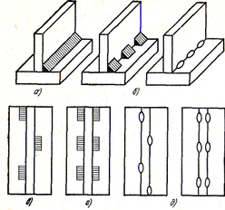 По форме поперечного сечения угловые швы могут быть без разделки кромок, (рисунок 4, а), с односторонней разделкой кромки (рисунок 4, б), с двусторонней разделкой кромок (рисунок 4, в). По протяженности угловые швы могут быть непрерывными (рисунок 5, а) и прерывистыми (рисунок 5, б), с шахматным (рисунок 5, в) и цепным (рисунок 5, г) расположением отрезков шва. Тавровые, нахлесточные и угловые соединения могут быть выполнены отрезками швов небольшой протяженности - точечными швами (рисунок 5, д).
