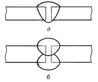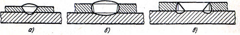 Пробочные швы по своей форме в плане (вид сверху) обычно имеют круглую форму и получаются в результате полного проплавления верхнего и частичного проплавления нижнего листов (рисунок 6, а) - их часто называют электрозаклепками, либо путем проплавления верхнего листа через предварительно проделанное в верхнем листе отверстие (рисунок 6, б).