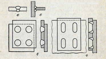 Прорезные швы, обычно удлиненной формы, получаются путем приварки верхнего (накрывающего) листа к нижнему угловым швом по периметру прорези (рисунок 6, в). В отдельных случаях прорезь может заполняться и полностью.