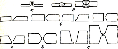 Стыковые швы, как правило, выполняют непрерывными; отличительным признаком для них обычно служит форма разделки кромок соединяемых деталей в поперечном сечении. По этому признаку различают следующие основные типы стыковых швов: с отбортовкой кромок (рисунок 3, а); без разделки кромок - односторонние и двусторонние (рисунок 3, б); с разделкой одной кромки - односторонней, двусторонней; с прямолинейной или криволинейной формой разделки (рисунок 3, в); с односторонней разделкой двух кромок; с V-образной разделкой (рисунок 3, г); с двусторонней разделкой двух кромок; Х-образной разделкой (рисунок 3, д). Разделка может быть образована прямыми линиями (скос кромок) либо иметь криволинейную форму (U-образная разделка, рисунок 3, е).