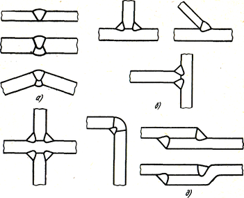 а) стыковые; б, в) тавровые; г) угловые; д) нахлесточные