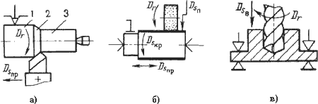 Рис.19.1 Схемы обработки заготовок: а – точением; б – шлифованием на круглошлифовальном станке; в – сверлением