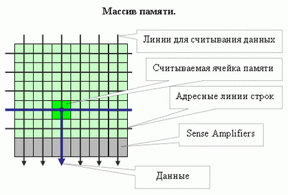 Чтобы считать информацию из ячейки, подаётся адресный сигнал в соответствующую строку (Row), происходит активация строки (Activate), с определенной задержкой, которая составляет 2—5 тактов процессора. Такая задержка называется RAS-to-CAS Delay в (BIOS за нее отвечает параметр tRCD). Для чтения подаётся команда на чтение (Read) и данные считываются из соответствующей колонки (Column) массива. Данные появляются на выходе с некоторой задержкой, составляющей 1—4 такта процессора.