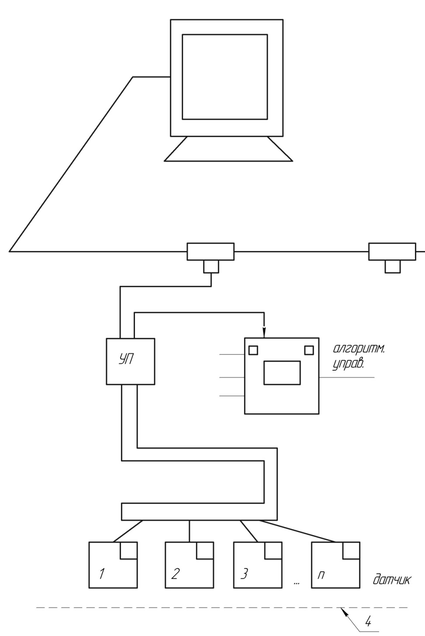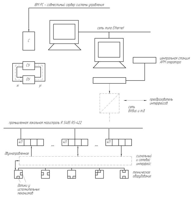 Центральная станция УВК или ПЭВМ обслуживает большое число промышленных контроллеров, объединенных через последовательный интерфейс типа Profibas или аналогов. Центральная станция обеспечивает функцию диспетчера локальной сети, сбора информации, обработки управлений в реальном масштабе времени для технологического оборудования. Через сетевой интерфейс центральная станция обращается к серверу С за необходимыми ресурсами (файлами, принтерами, базами данных и др.)