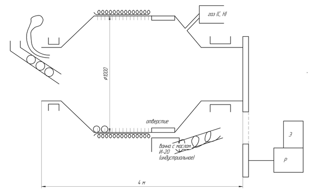 Справа цепной привод. Имеются подшипники. Со всех сторон нагреватели. Печь вращается с помощью привода с небольшой скоростью. Внутри детали совершают движение – винт Архимеда.