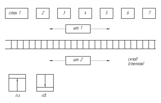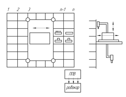 – кран-штабелёр. Имеются приемные позиции. Робот может перемещаться по всему многоярусному стеллажу. ППВ – приемная позиция выгрузки. Кран-штабелёр и обслуживаемый им стеллаж позволяет адресно хранить необходимую для обработки заготовки детали, приспособления, инструменты в строго заданном адресном порядке и позволяет выводить эти грузы в необходимой последовательности. Каждая ячейка имеет свой адрес и каждый груз имеет свой код. К позиции выгрузки подъезжает устройство (робокар) и по определенной команде перегружает на робокар тот груз, который необходим для работы. Автоматически осуществляется загрузка склада.