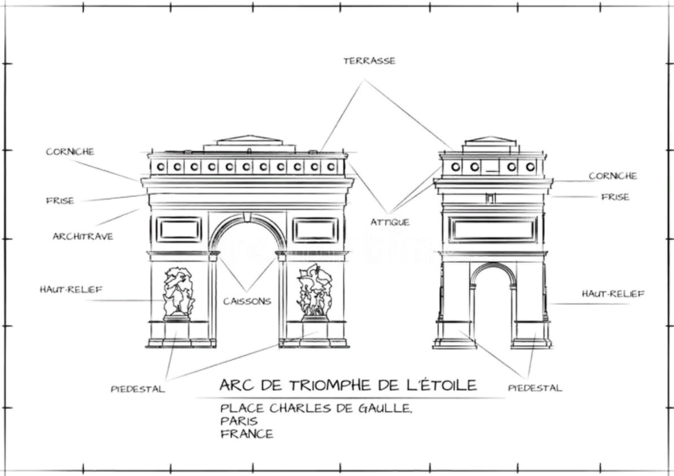 Кроме того, на опорах Триумфальной арки в Париже написаны названия 128 битв, в которых побеждала армия Франции, а также имена 660 военачальников. Фамилии тех из них, кто пал в бою, перечеркнуты. Монумент окружают массивные тумбы из гранита, которые соединяют тяжелые чугунные цепи. Они отмечают сто дней, когда правил Наполеон.