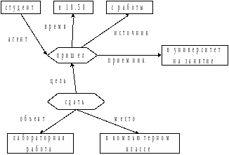 Представим в виде семантической сети предложение: «Студент пришел в 18.50 с работы в университет на занятие, чтобы сдать лабораторную работу в компьютерном классе».