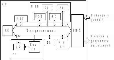 Интерфейс МП (ИМП) предназначен для связи и согласования МП с системной шиной ЭВМ. Принятые команды и данные временно помещаются в кэш-память второго уровня. Размер кэш-памяти второго уровня – 256-2048 Кбайт. Ранее кэш-память второго уровня размещалась на материнской плате.