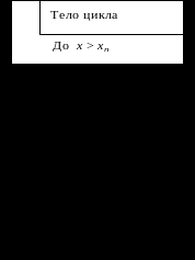 | 5. Блок цикла с предусловием реализует циклическую структуру с проверкой условия в начале цикла. Условие продолжения цикла размещается в верхней полосе, сливающейся с левой, указывающей границу цикла. Данный блок может быть использован и для обозначения цикла с параметром, тогда вверху указывают закон изменения параметра цикла. | |