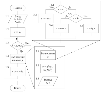 Процесс проектирования алгоритма табулирования функции у = f(x) показан на Рис. 9 .30, а. На первом уровне детализации схема отражает процесс табулирования функции в общем виде (блоки 1.1-1.5). Далее осуществляется детализация блока 1.4 в виде последовательности блоков 2.1-2.3 второго уровня. Функция z = z(x), входящая в определение исходной функции, представлена разветвляющейся структурой третьего уровня детализации (блоки 3.1-3.5).