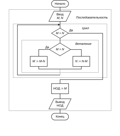 Рис. 9.29. Алгоритм Евклида как композиция базисных структур