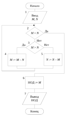 Блок-схема алгоритма Евклида представлена на Рис. 9 .25, где блок 1 есть подготовка цикла, блок 2 – управление циклом, блоки 3, 4, 5 – тело цикла (разветвляющаяся структура), из них блоки 4, 5 являются блоками модификации значений переменных цикла M и N. □