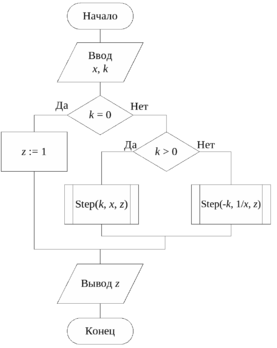 Алгоритм вычисления z = xk построим, используя вспомогательный алгоритм Step вычисления степени с натуральным показателем. Схема алгоритма приведена на Рис. 9 .48.