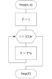 В качестве примера рассмотрим алгоритм вычисления степени y := an с натуральным показателем n (см. Рис. 9 .40). Оформим его как вспомогательный алгоритм. На Рис. 9 .47 приведена схема вспомогательного алгоритма, его имя – Step, его входные параметры – n, a, выходной параметр – y.