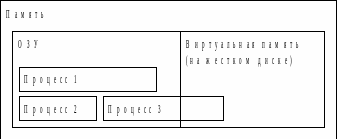 После запуска процесса ему выделяется адресное пространство. В памяти могут располагаться несколько процессов, причем один процесс не имеет доступ к адресному пространству другого процесса. Если объема ОЗУ не хватает для выполнения всех процессов, то выделяется виртуальная память на жестком диске, где хранится часть данных процесса. Жесткий диск, на котором располагается виртуальная память, гораздо медленнее, чем ОЗУ, поэтому в виртуальной памяти хранятся процессы, остановленные в данный момент или с самым низким приоритетом.