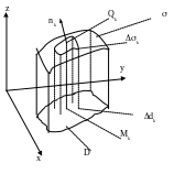 | Пусть поверхность , площадь которой надо вычислить, задана уравнением F(x, y, z) = 0 или уравнением z = f(x, y). Введем разбиение на ячейки k, не имеющие общих внутренних точек, площадью vk. Пусть область и ячейки k проектируются на плоскость OXY в область D и ячейки dk площадью sk. Отметим на ячейке dk точку Mk. В точке Qk (ячейки k), которая проектируется в точку Mk, проведем единичный вектор нормали nk {cosk, cosk, cosk} к поверхности и касательную плоскость. Если приближенно считать равными площадь vk ячейки k и площадь ее проекции на касательную плоскость, |